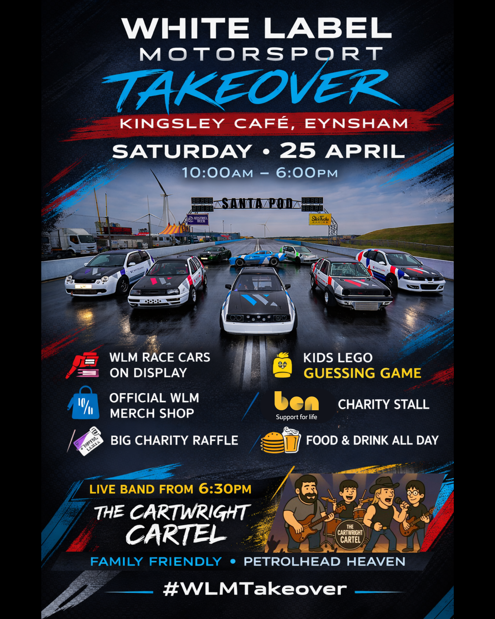 We’re excited to welcome White Label Motorsport to Kingsley this April, bringing a lineup of high-performance VW, Audi and Porsche drag cars for a special display, alongside official merch, a kids’ Lego guessing game and a charity raffle running throughout the day.